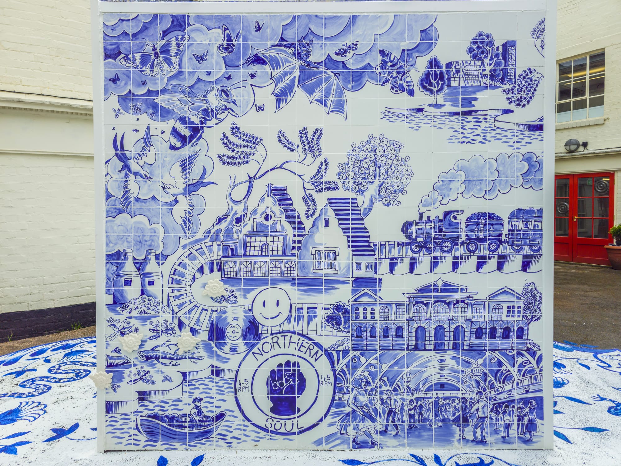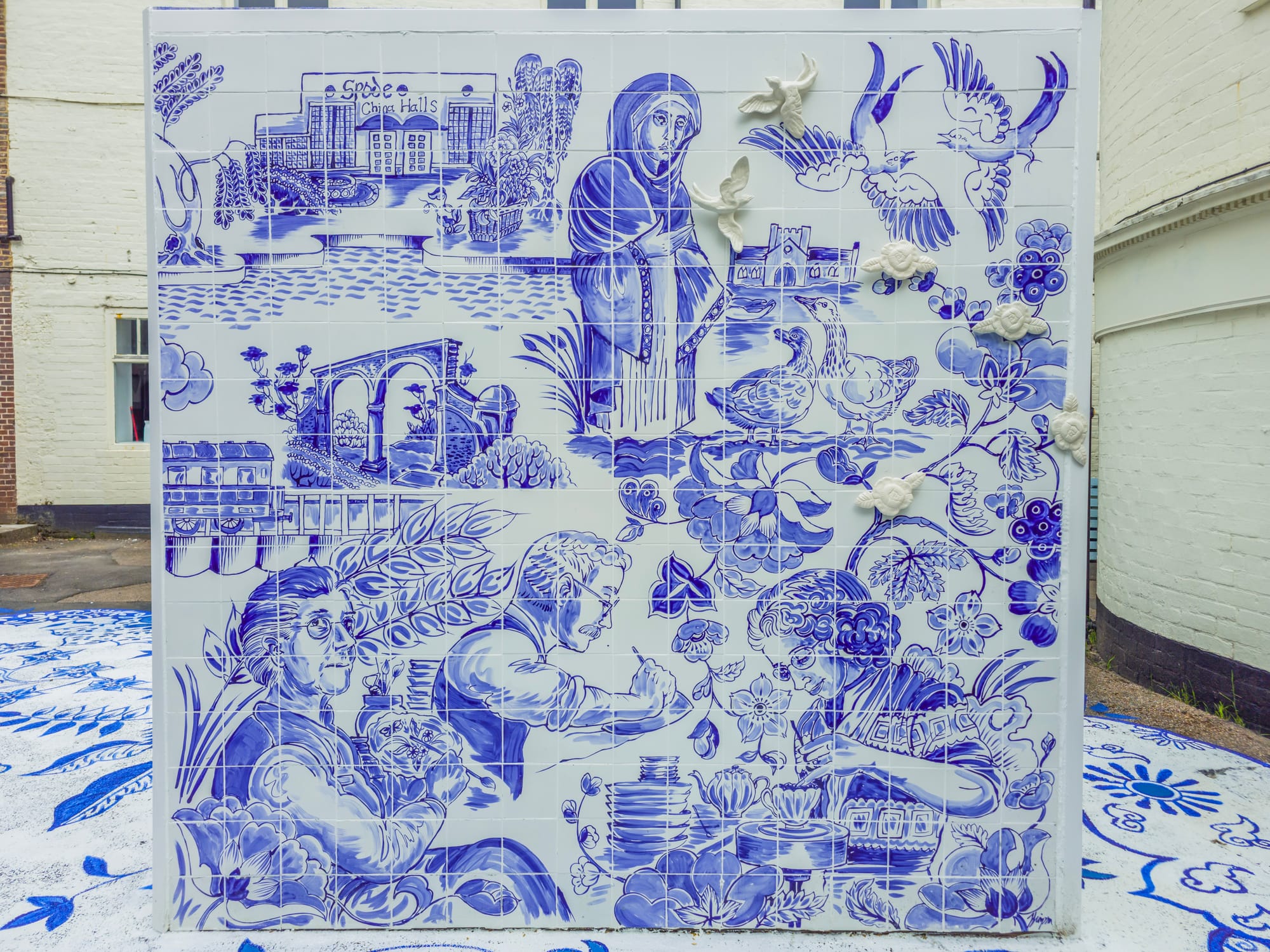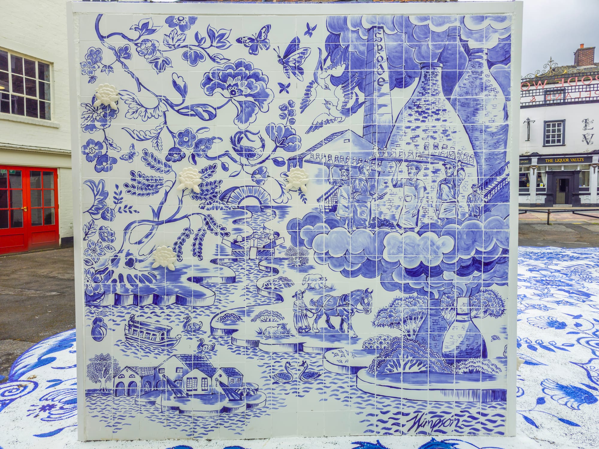 "Cobalt Chronicles" draws inspiration from Spode's classic blue and white Italian patterns. The installation features a stunning array of hand-painted porcelain tiles and graffiti-style murals, vividly narrating the tales of Stoke Town. It stands proudly in the Spode courtyard, beckoning visitors to explore the intertwined stories of the community and its pottery legacy.