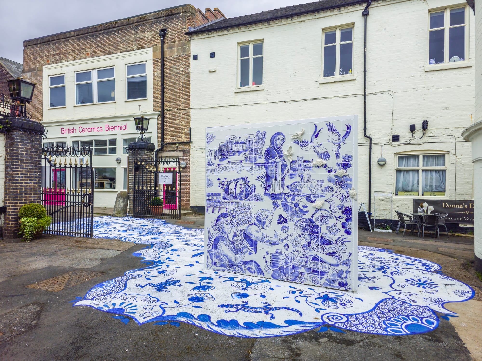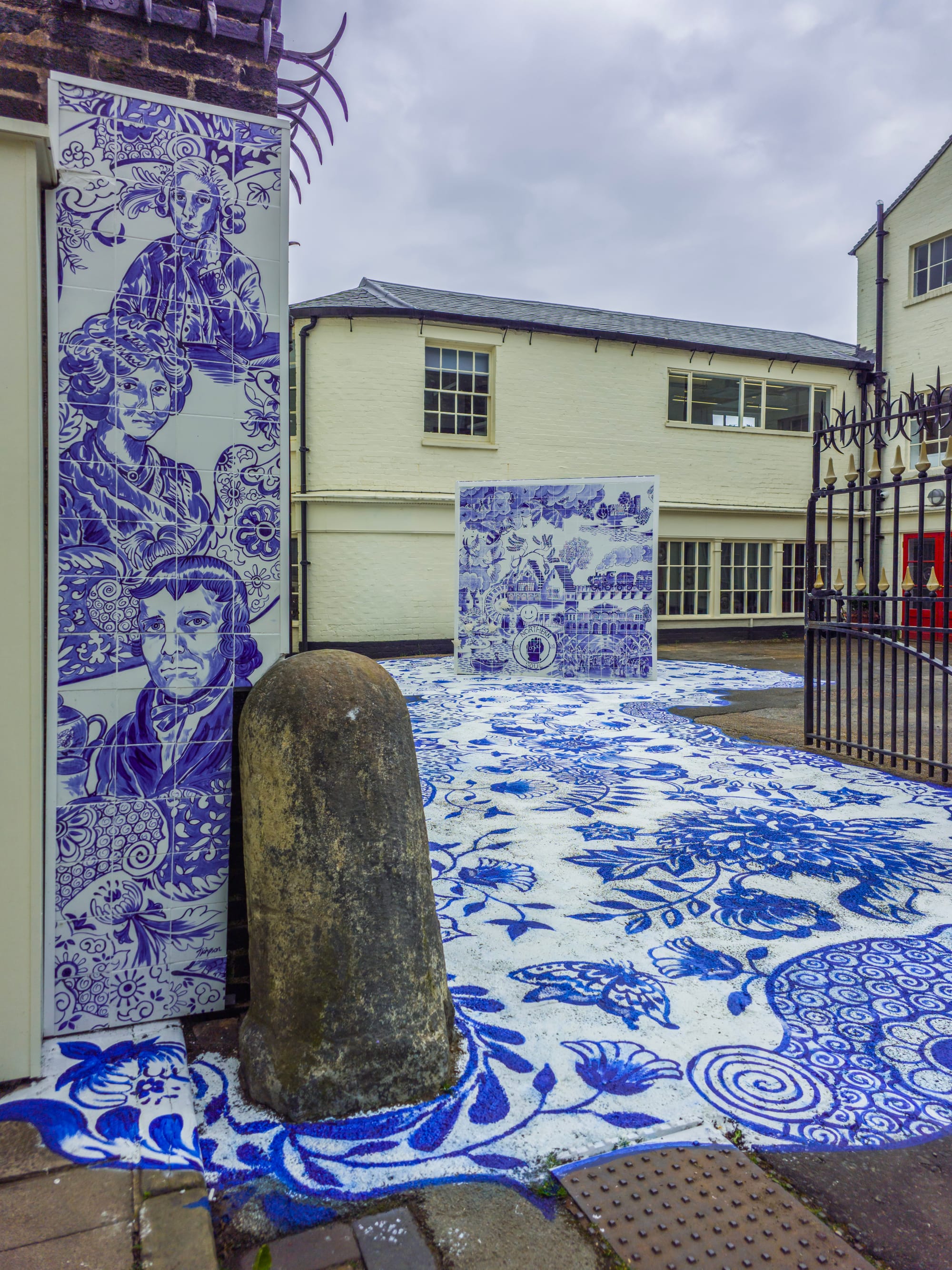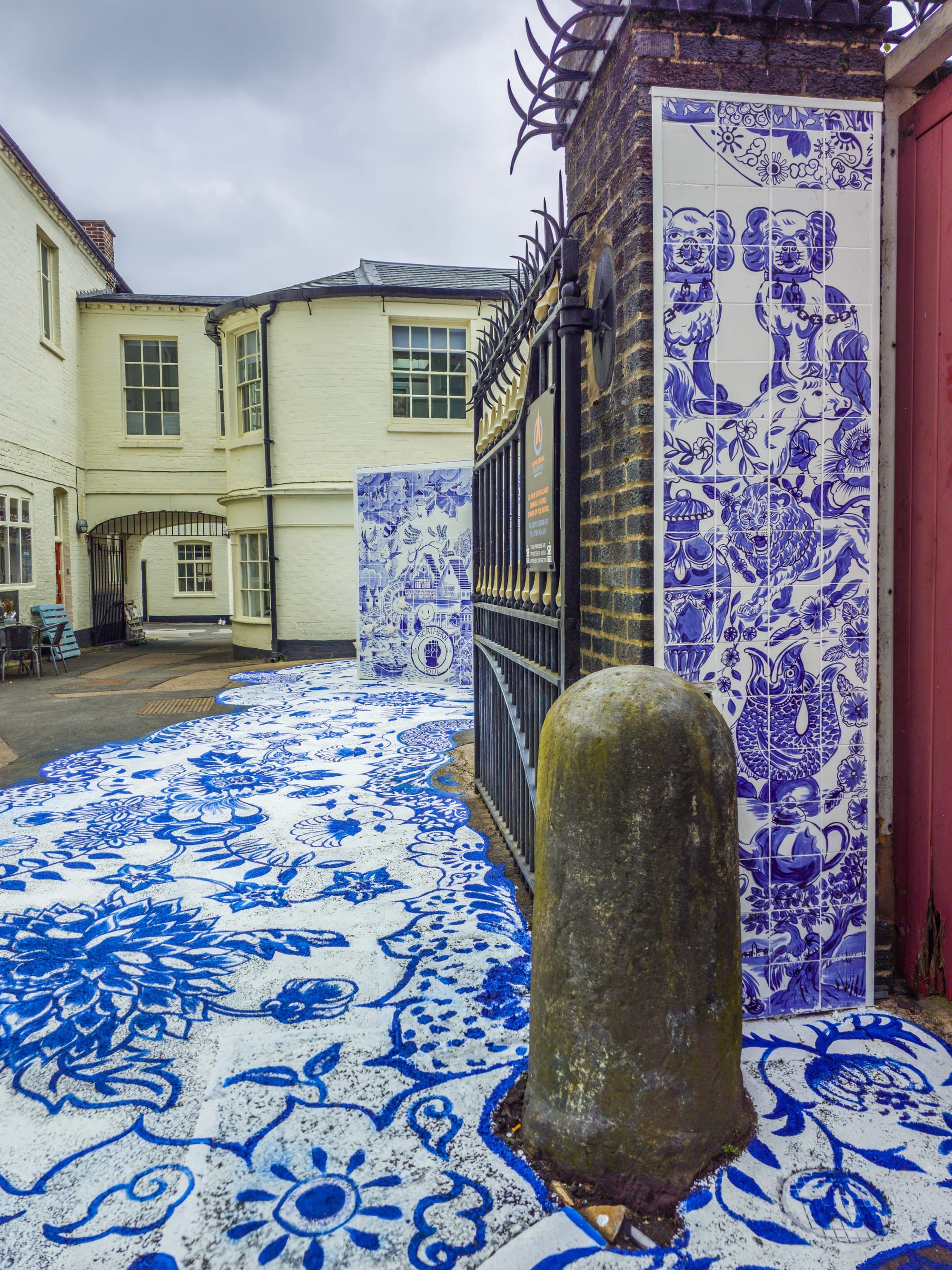 "Cobalt Chronicles" draws inspiration from Spode's classic blue and white Italian patterns. The installation features a stunning array of hand-painted porcelain tiles and graffiti-style murals, vividly narrating the tales of Stoke Town. It stands proudly in the Spode courtyard, beckoning visitors to explore the intertwined stories of the community and its pottery legacy.