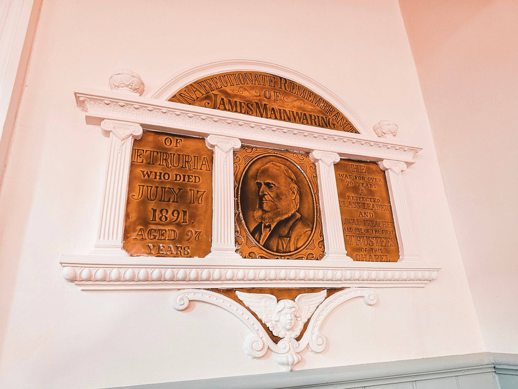 Inside, the chapel is a trove of local history. Among its many memorials, an unusual earthenware tribute stands out, dedicated to James Mainwaring. He served not only as one of the chapel's earliest trustees but also preached for an impressive seven decades.