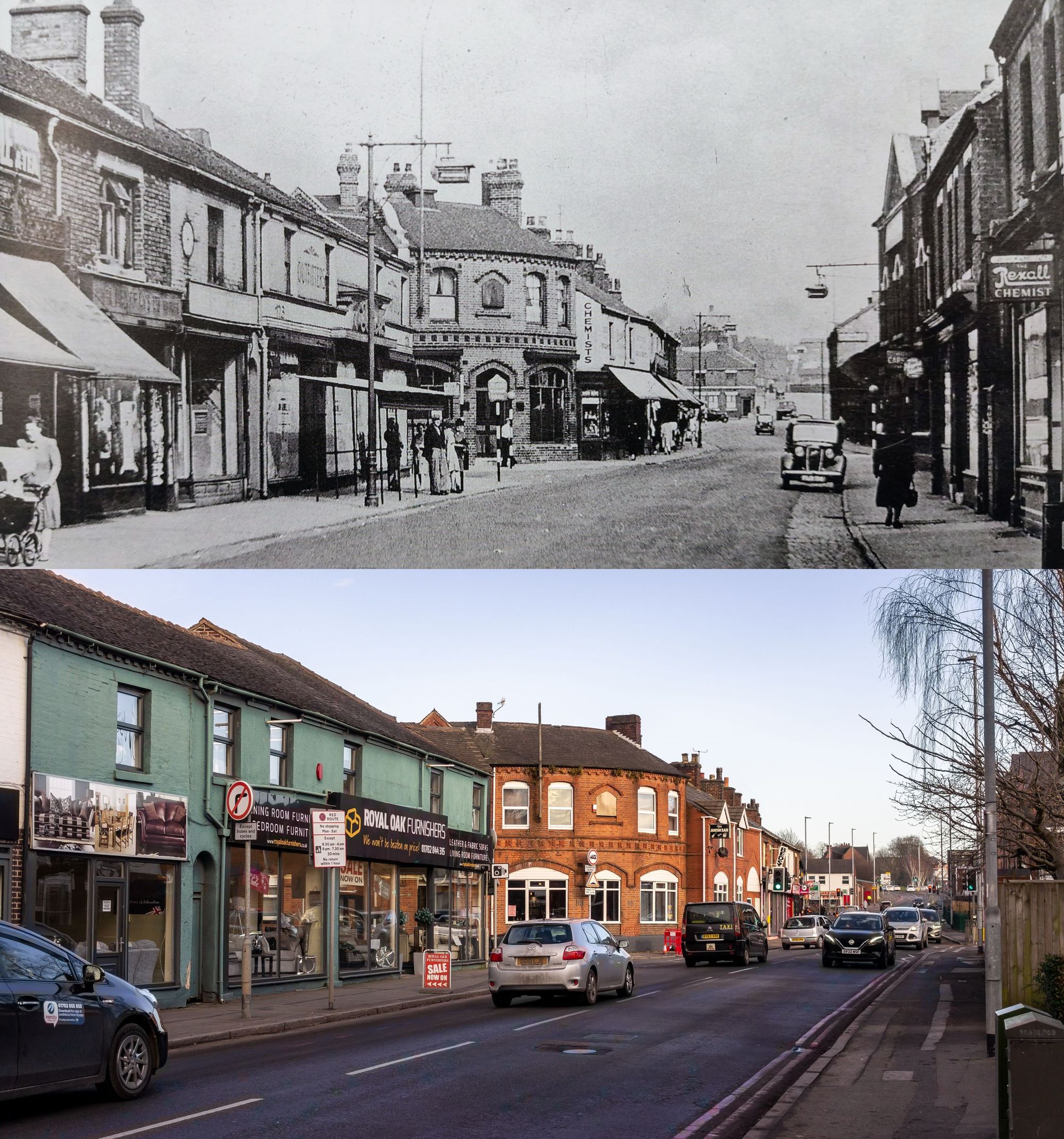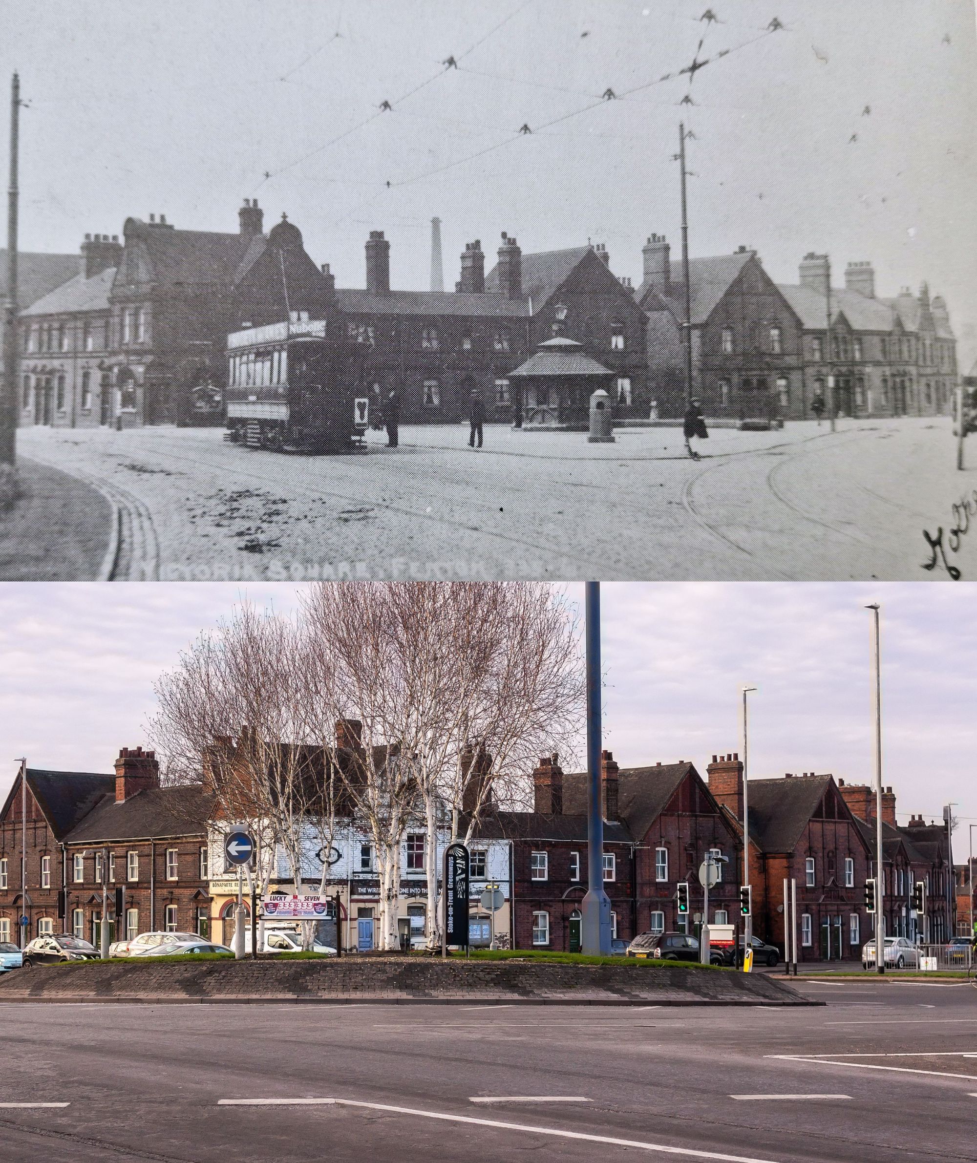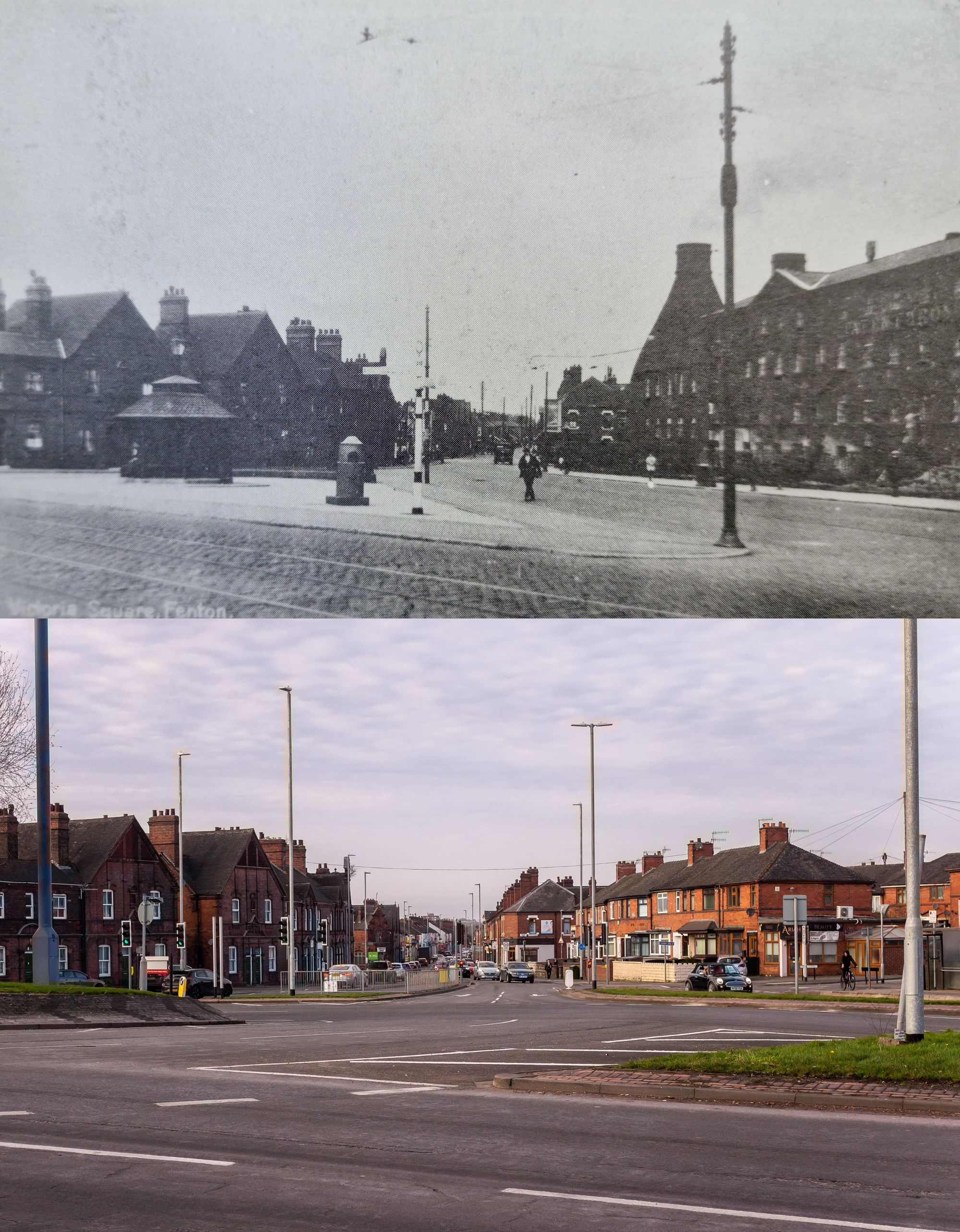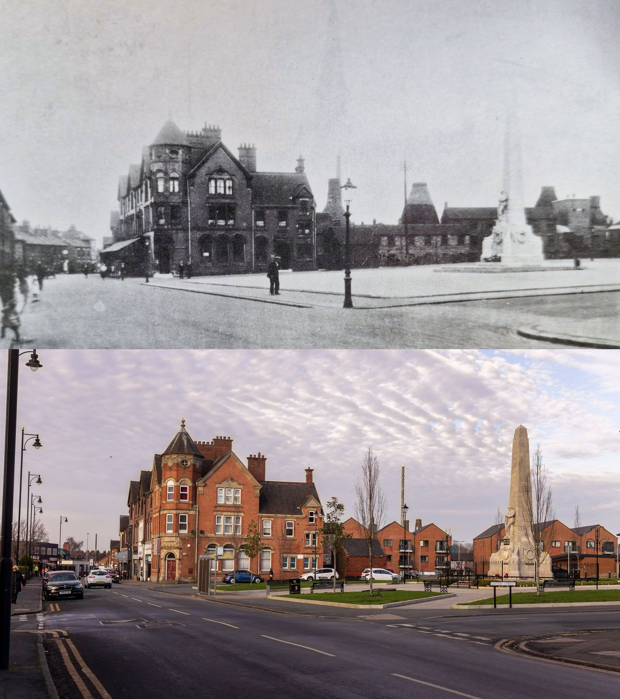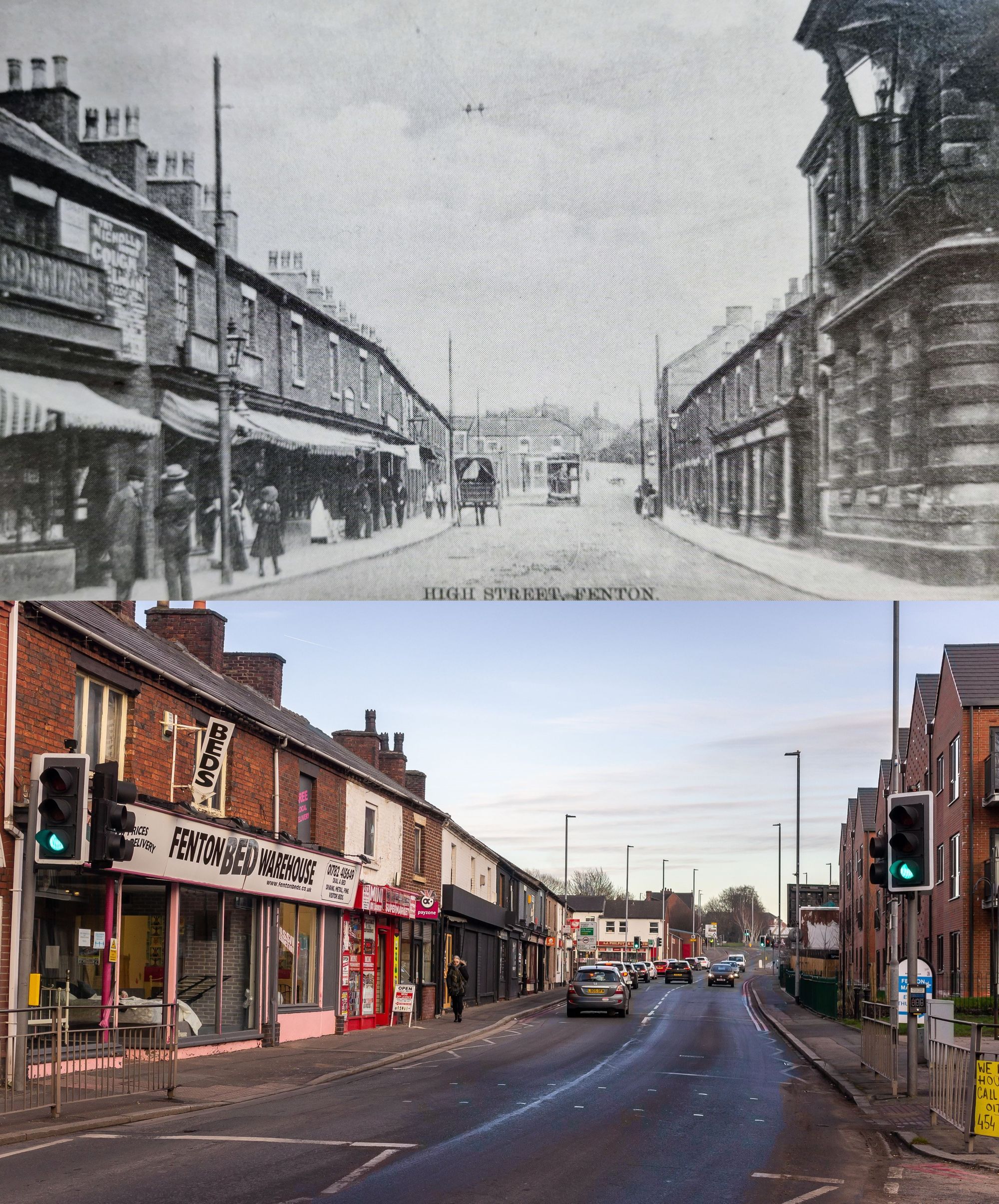 The old photo shows the industry of the time, the bottle kilns and chimneys that were a part of the factories that made Fenton what it is. However, those have been replaced with modern homes, that sits nicely with the heritage buildings of the area. The beautiful former Lloyds Bank building still sits proudly on the corner of the square, having hardly changed at all.
