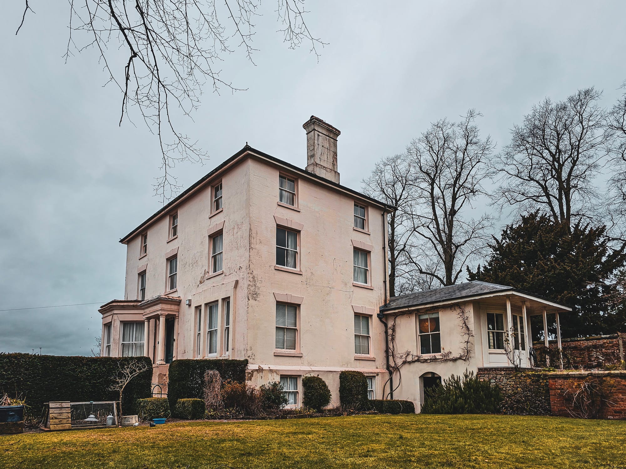 This Grade II listed building incorporates a medieval undercroft from the 13th or 14th century, which is believed to be a part of the original Stone Priory. The house, constructed of stuccoed brick with timber-framed internal walls, features a hipped roof and a distinctive L-plan design. The interior includes exposed coursed squared stone and square-framed internal walls with 18th-century brick infill.
