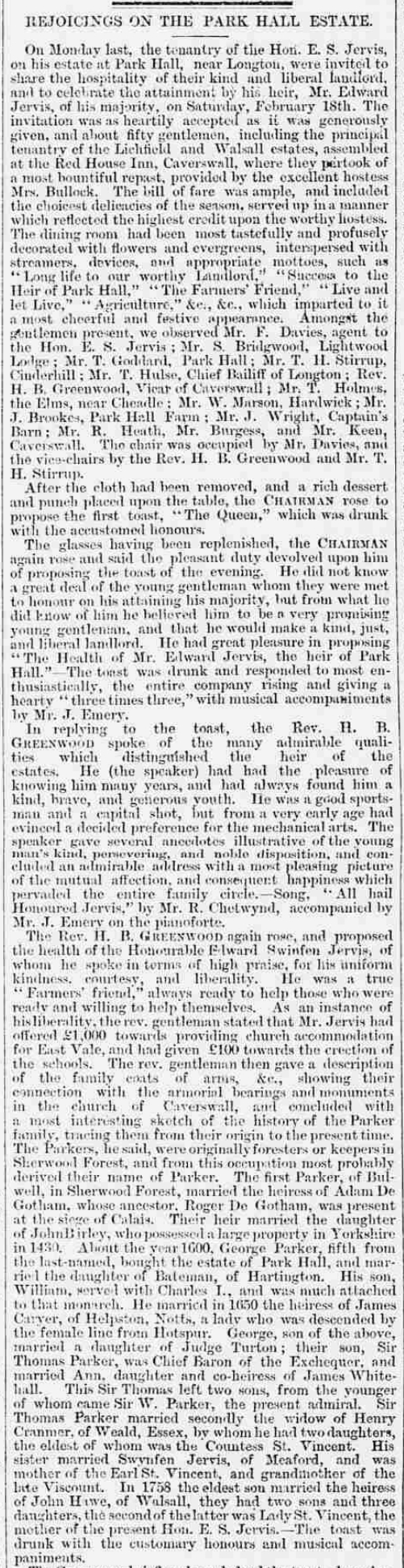 Their daughter was The Hon. Mary Anne Jervis, Lady Forester of Meaford Hall, (1803 - 1893). Their son, her brother, was the Hon. Edward Swynfen Parker-Jervis (1815 - 1896). He lived at Park Hall with his wife, Mary Barker. Their second son John St. Vincent Parker Jervis (1840 - 1892) also lived at the hall with his wife Anne Hotham. He was also a Justice of the Peace. They had no children.