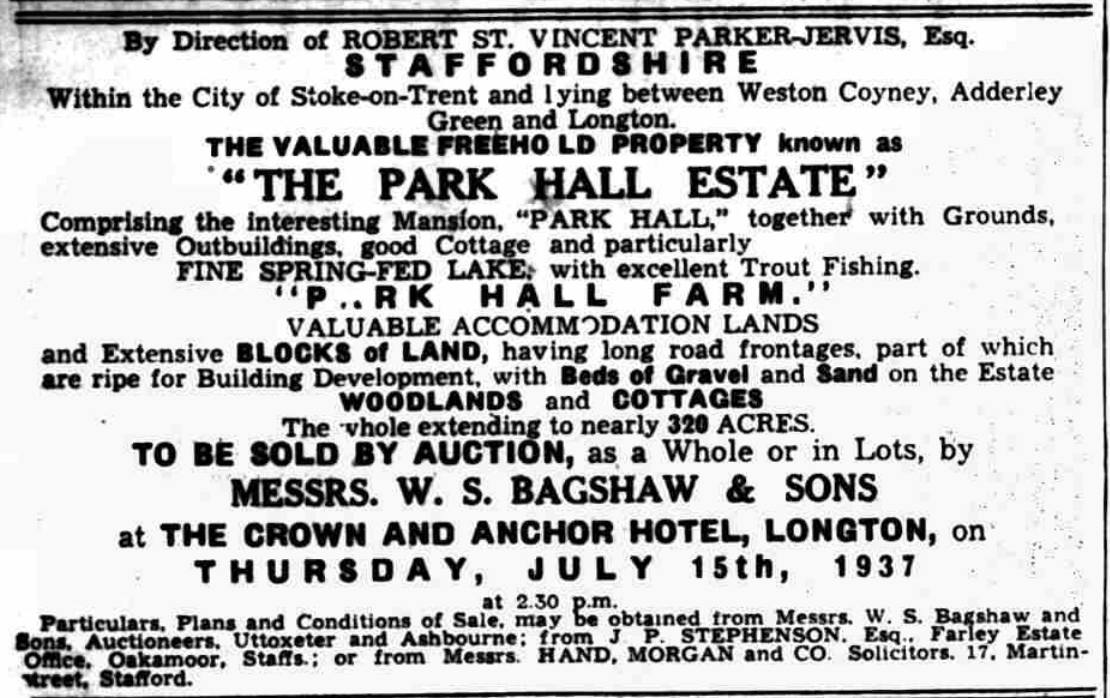 By the 1930s, Park Hall found itself without occupants, and in 1937, the estate was put on the market by Robert St Vincent Parker-Jervis (1908 - 1973). The sales brochure detailed features such as a stone-flagged entryway leading to three reception areas with oak flooring; and two featured intricately carved wood fireplaces. Additional spaces included a cloakroom, a butler’s pantry, and a servants' hall, along with various domestic spaces and cellars below ground. The upper level, accessible by dual staircases, housed six bedrooms, three dressing areas, and a bathroom, with another eight rooms located on the floor above.