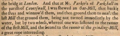 Further expanding on his explorations, Dr Plot mentions William Parker, a member of the Parker family, who not only introduced him to this oat mill but also accompanied him on his exploratory journeys in the vicinity of Park Hall. William Parker showed Dr Plot two significant watermills, which likely played a crucial role in the local agricultural and technological landscape. These watermills, paired with the innovative oat mill, underscore the Parker family's deep-rooted interest in and commitment to advancing agricultural productivity through technological innovation.