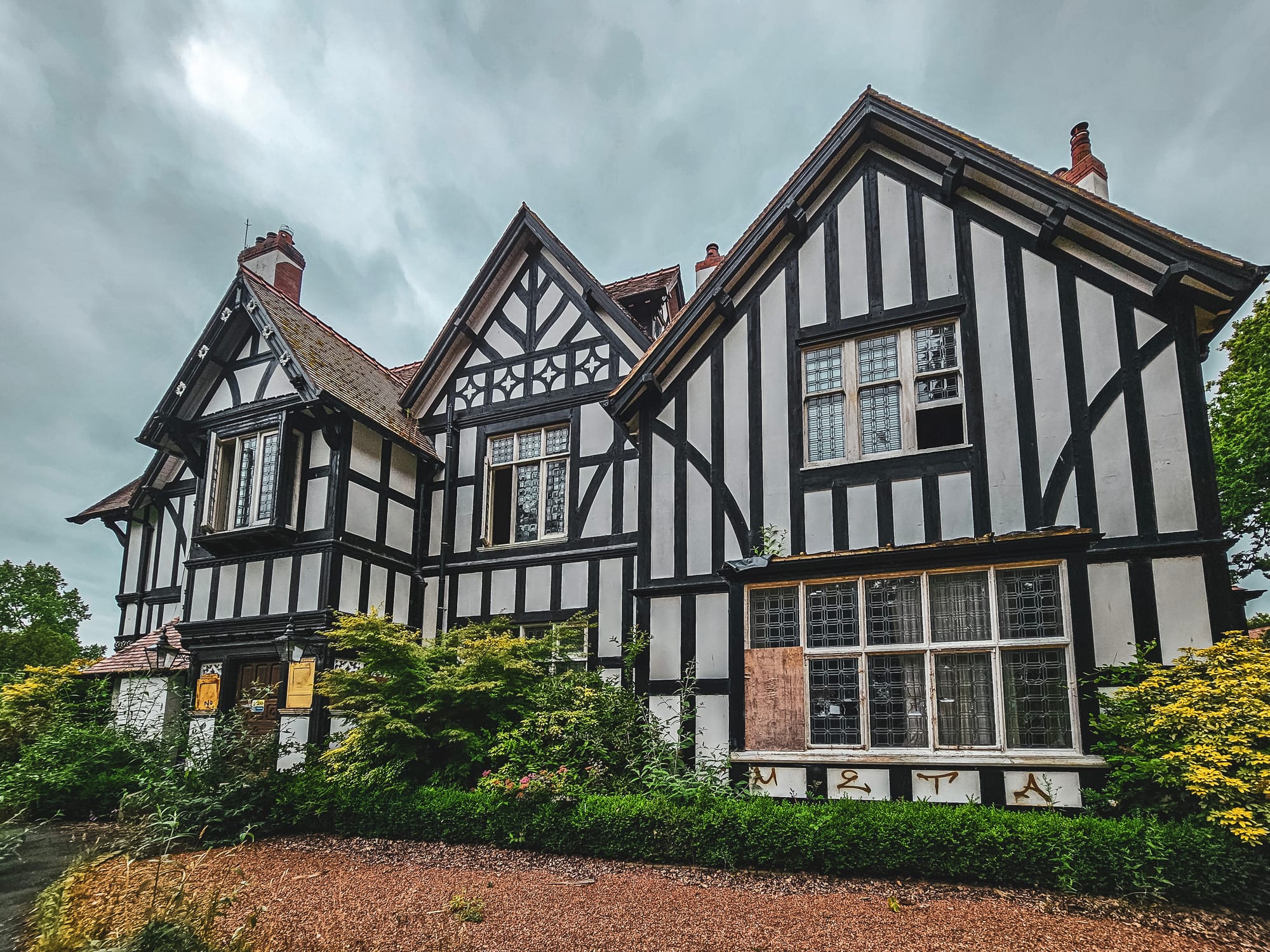 Tilstone House is a masterclass in neo-Tudor design, with a timber-framed façade reflecting the style of renowned Cheshire country houses. The south front is dominated by an octagonal tower topped by a spire, complemented by a first-floor balcony. The modern west wing, expertly copied from the original, culminates in a tower and spire matching the main block. The west (entrance) front presents a romantic version of a Tudor past, featuring a gabled turret, enriched bargeboards with Tudor Roses, and a lavishly carved main door bordered by Perpendicular Gothic-inspired windows. The intricate details of the house include the lavishly carved main door and simplified chimney stacks that were rebuilt at some point in its history.