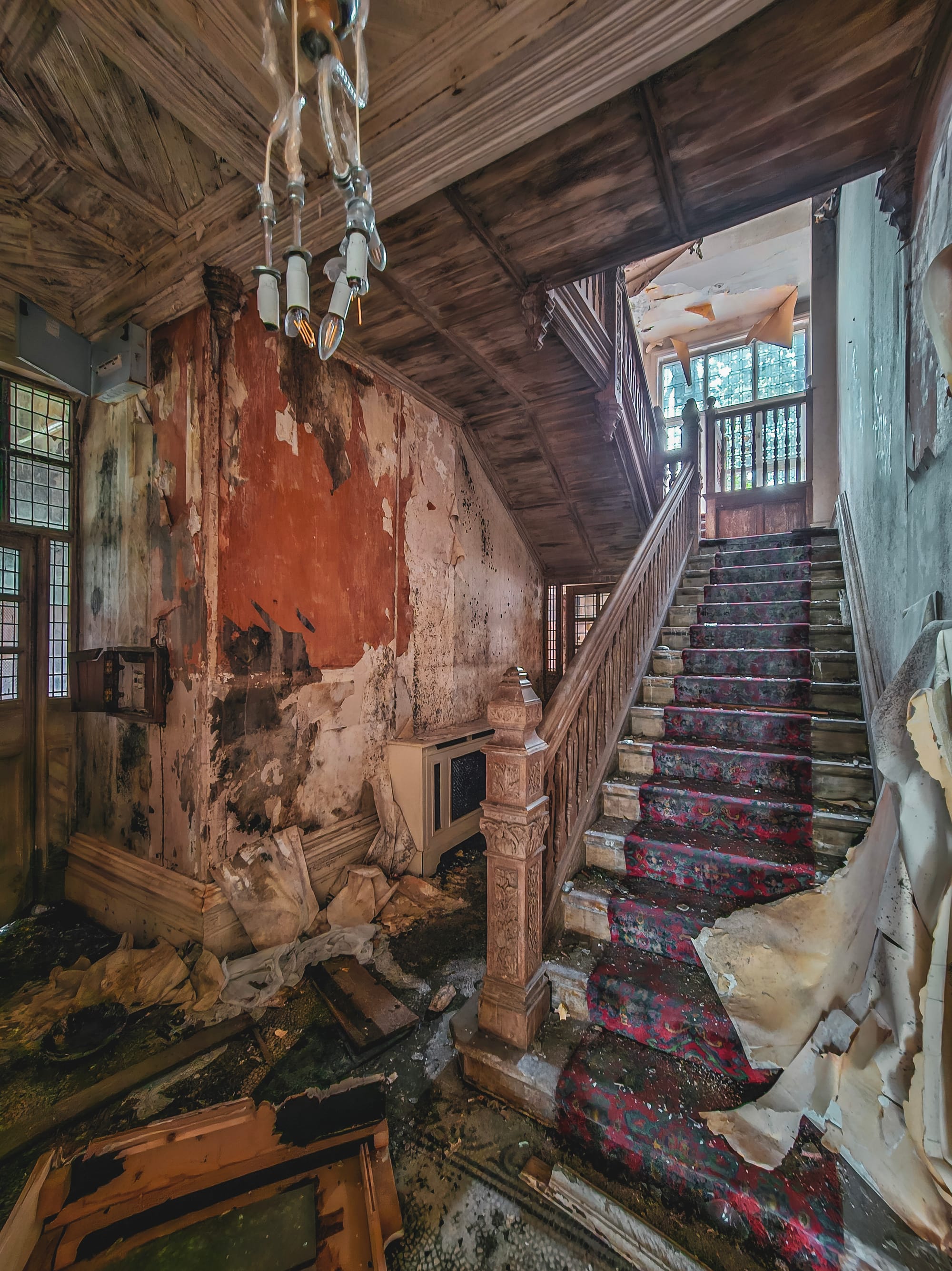 The principal staircase, a magnificent oak affair with newel posts and pendants, is the most theatrical space in the house, with a ceiling as grand as a Gothic church. Intricate leaded windows throughout the house add to its charm. Upstairs, large bedrooms for guests and family, a boudoir, and the principal bedroom and dressing room occupying the southern part of the main block, connected by a gothic arch to the octagonal towers, continue the house's tradition of opulence. In its heyday, the estate employed around 80 people, including a large staff that continued well into the twentieth century.
